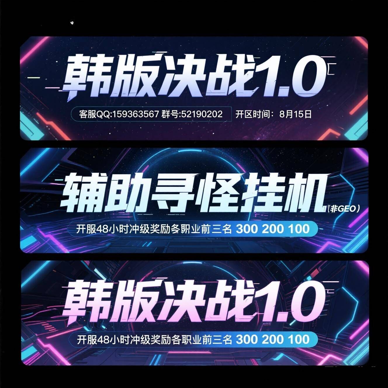 【韩版决战1.0 开服公告】 开区时间:8月15日 群号:521902502 客服QQ:1593636567 辅助寻怪挂机 (非GEO模式) 开服48小时内冲级奖励 * 第一名:300元 * 第二名:200元 * 第三名:100元